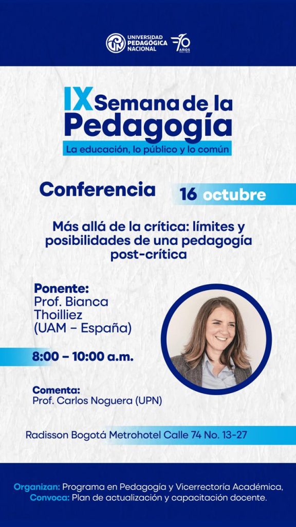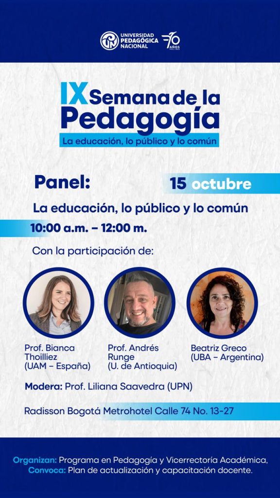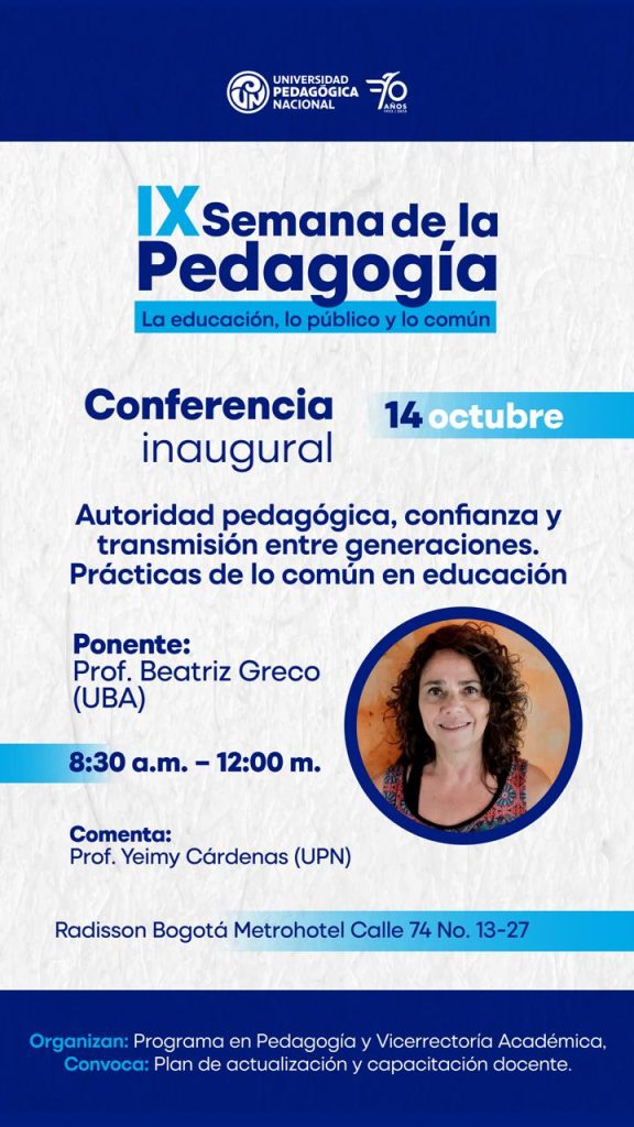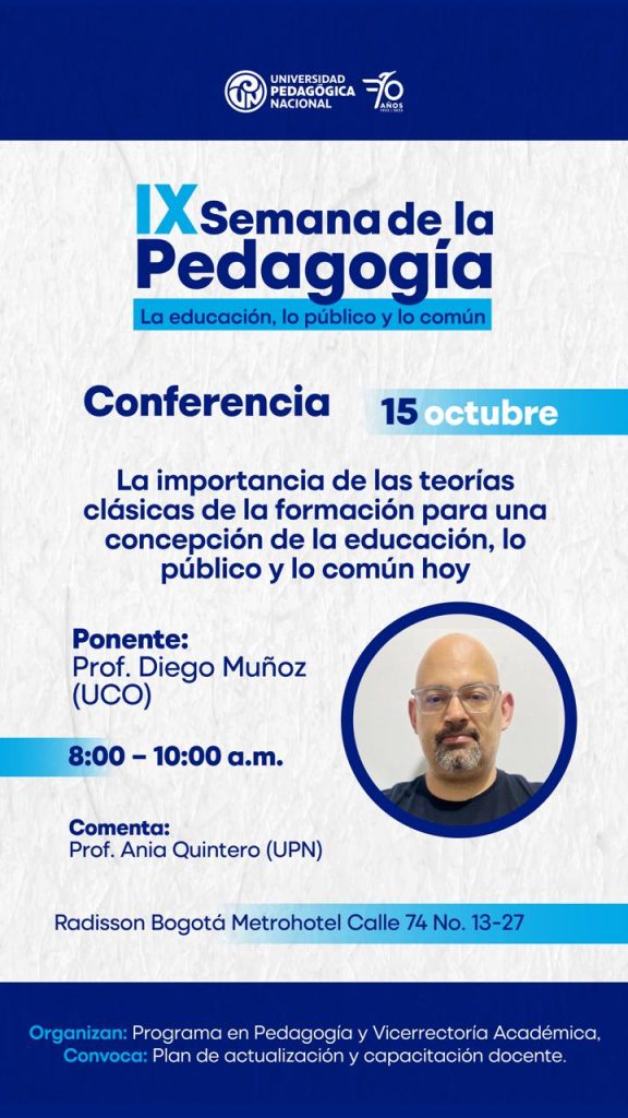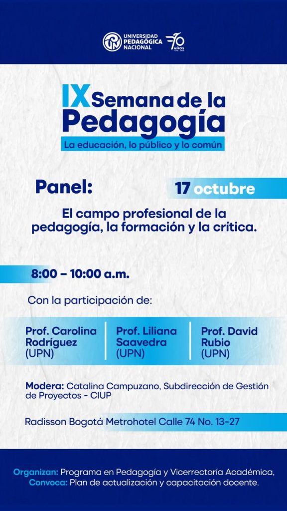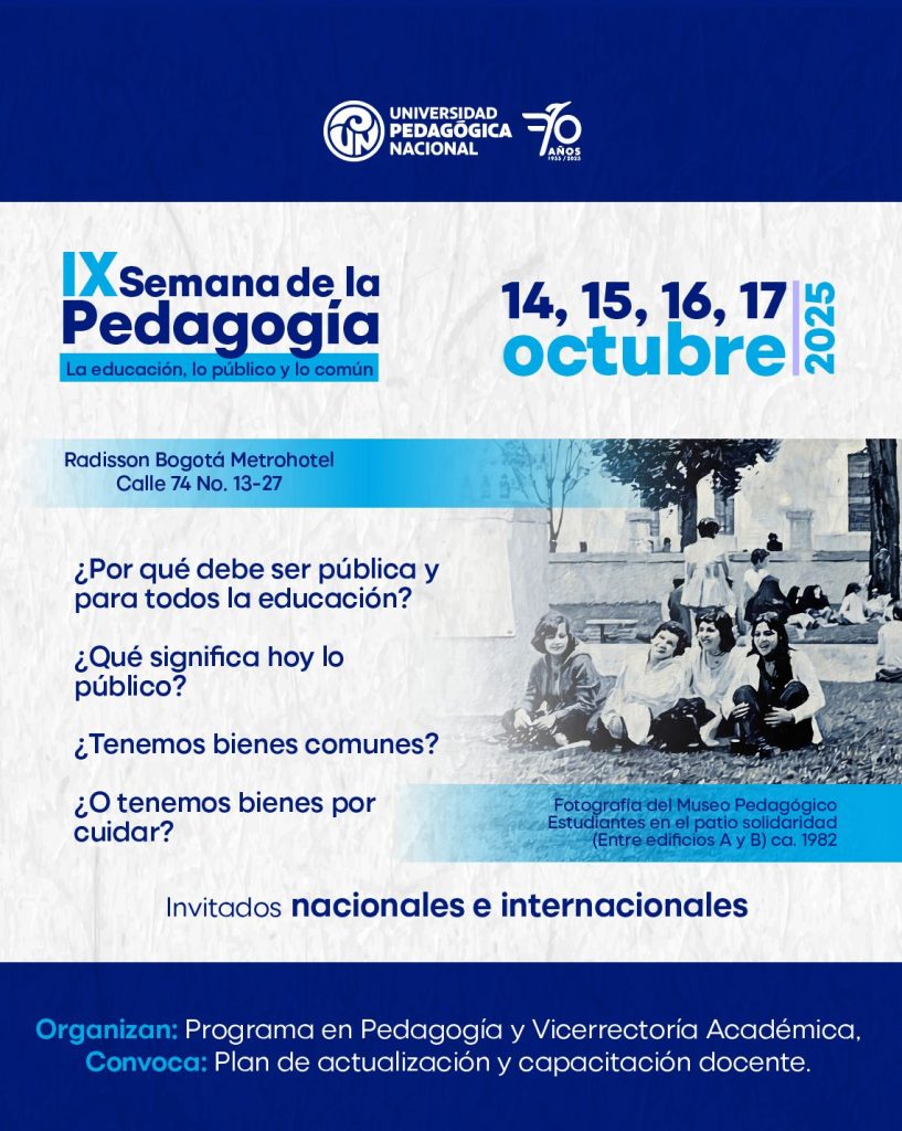La Universidad Pedagógica Nacional (UPN) invita a la comunidad académica a participar en la IX Semana de la Pedagogía. Este evento, que se desarrollará del 14 al 17 de octubre de 2025 en el Radisson Bogotá Metrohotel (Calle 74 #13-27), contará con conferencias, foros y paneles con expertos internacionales.